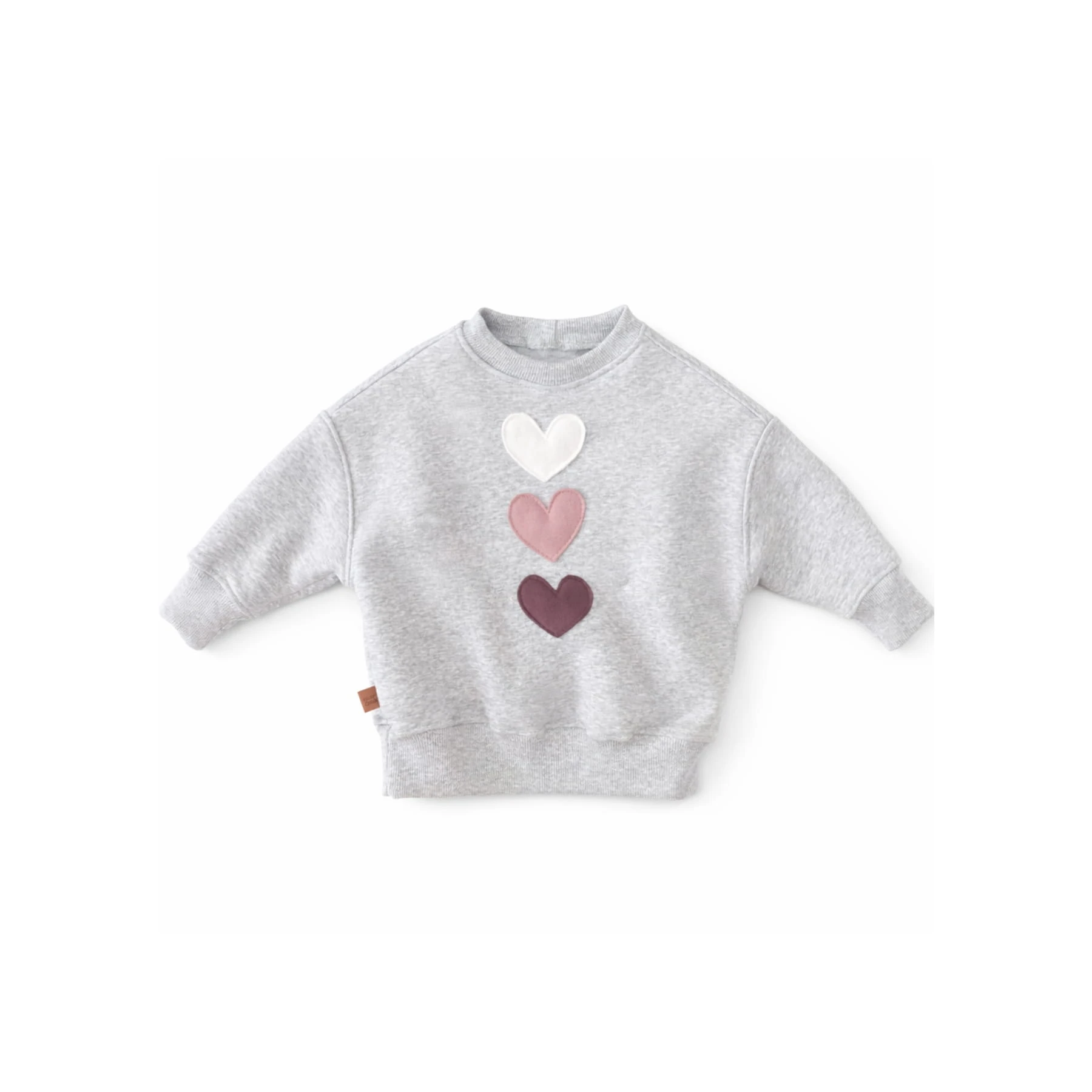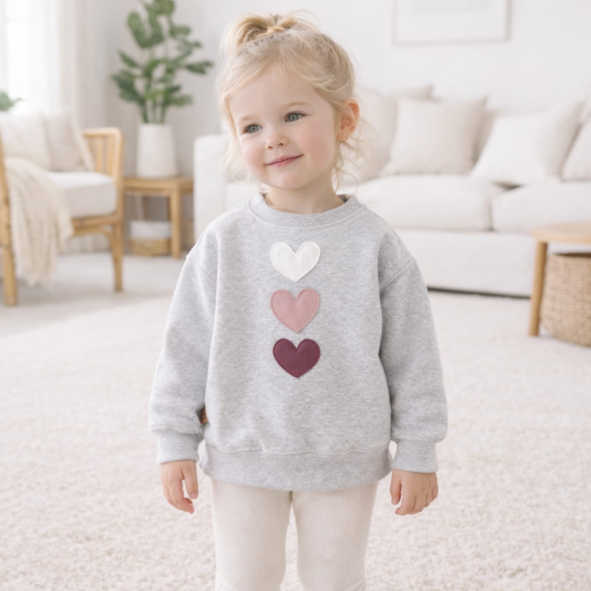 Charakterystycznym elementem bluzy są trzy naszyte serduszka. Ten prosty, ale znaczący detal symbolizuje bliskość, ciepło i relacje, które są ważną częścią dzieciństwa.
