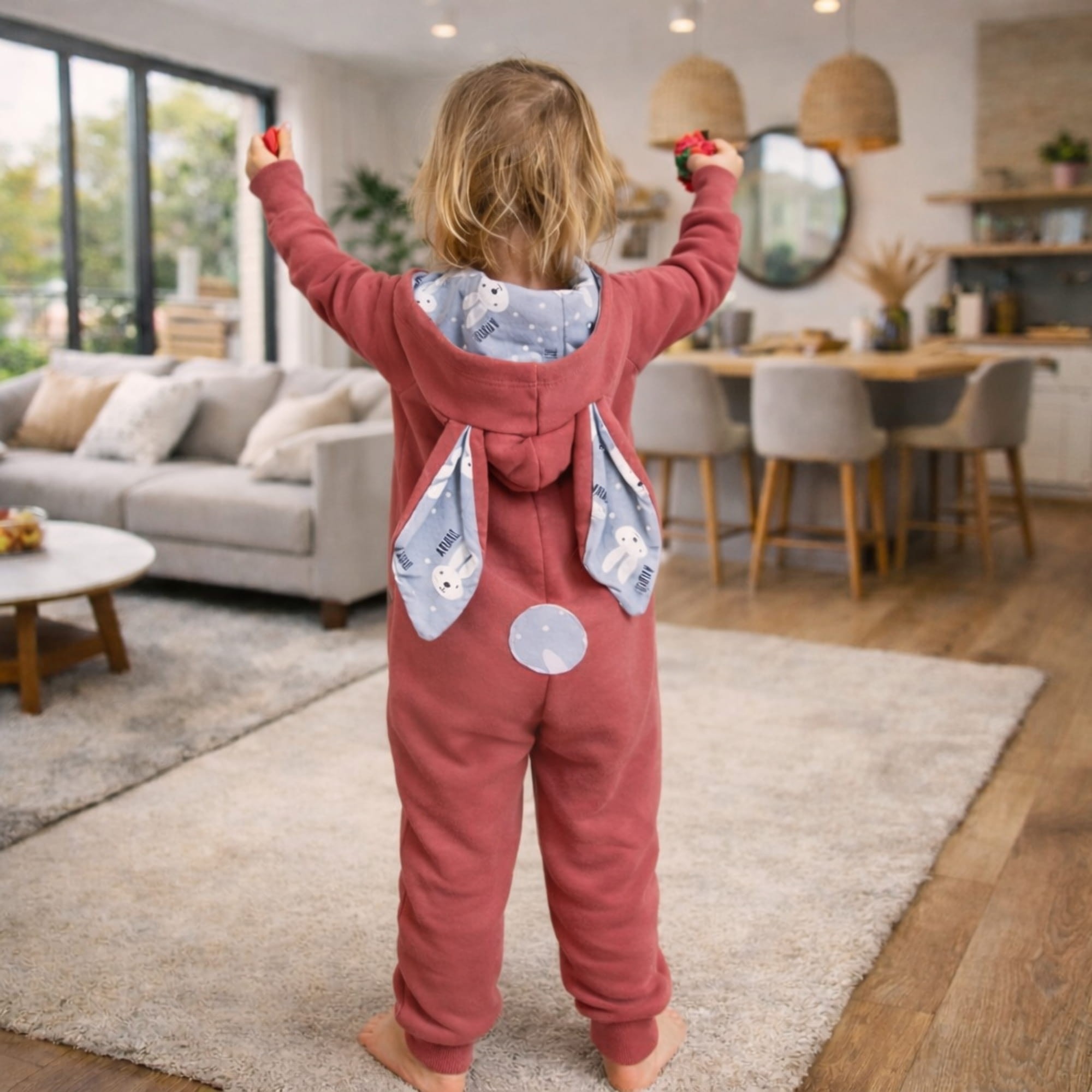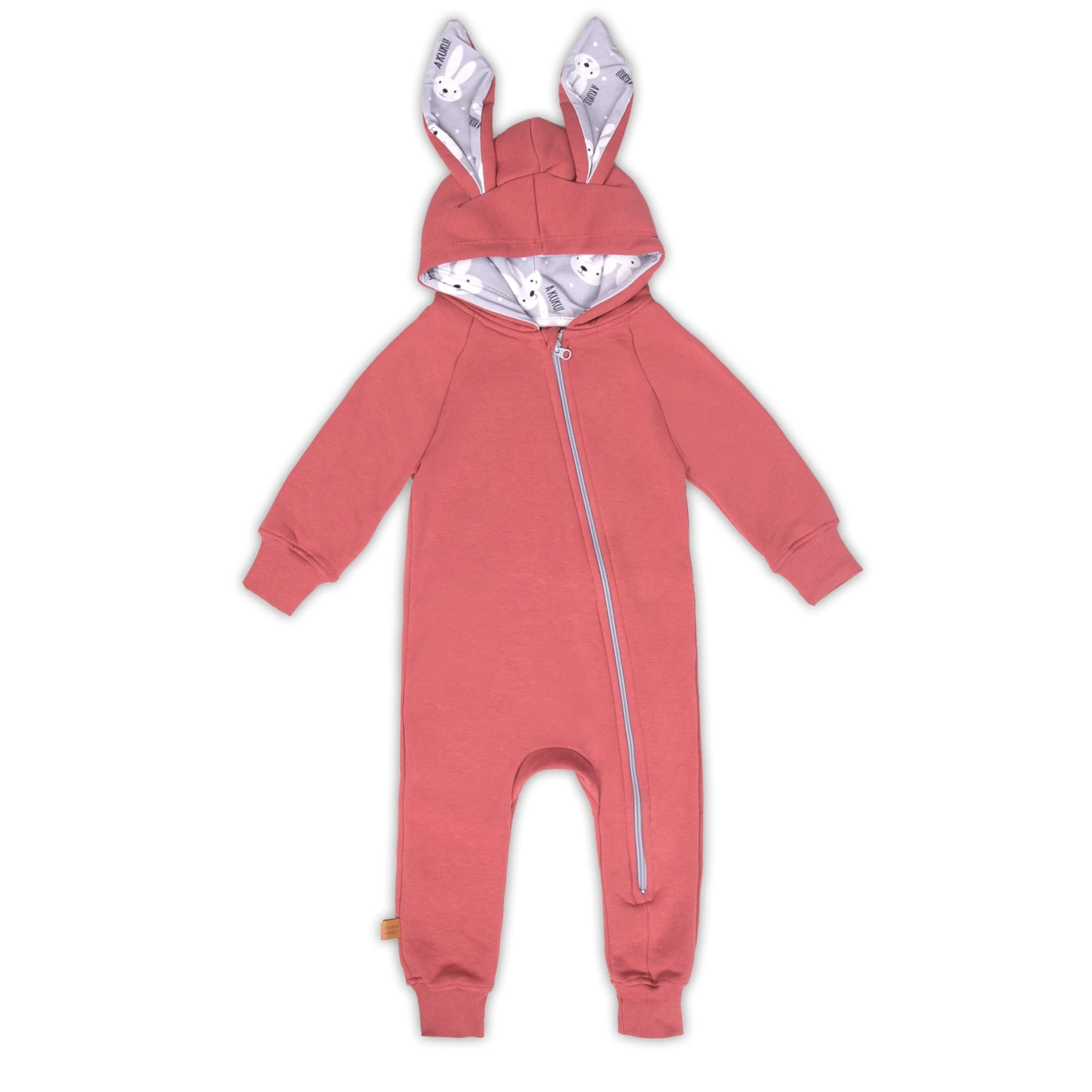 Kombinezon dziecięcy z uszami królika – mięsisty rampers uszyty z wysokiej jakości dzianiny 320 g/m² (80% bawełna, 20% poliester).