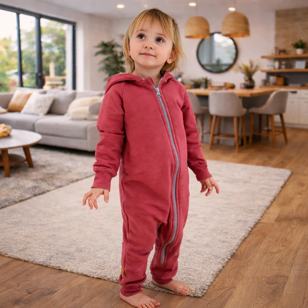 Rampers z uszami w kolorze koral to ciepły, wygodny kombinezon dziecięcy uszyty z mięsistej dzianiny o gramaturze 320 g/m2 (80% bawełna, 20% poliester), łączy miękkość naturalnego włókna z wytrzymałością konstrukcyjną.