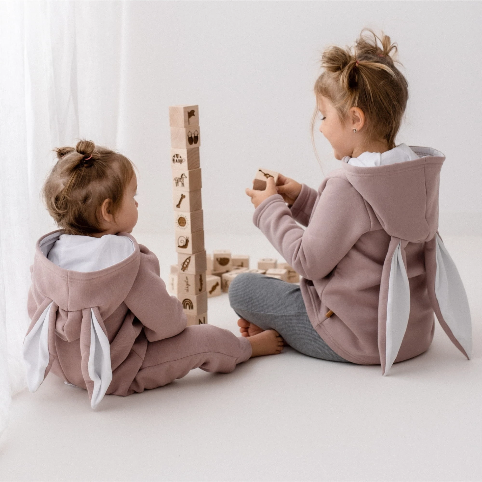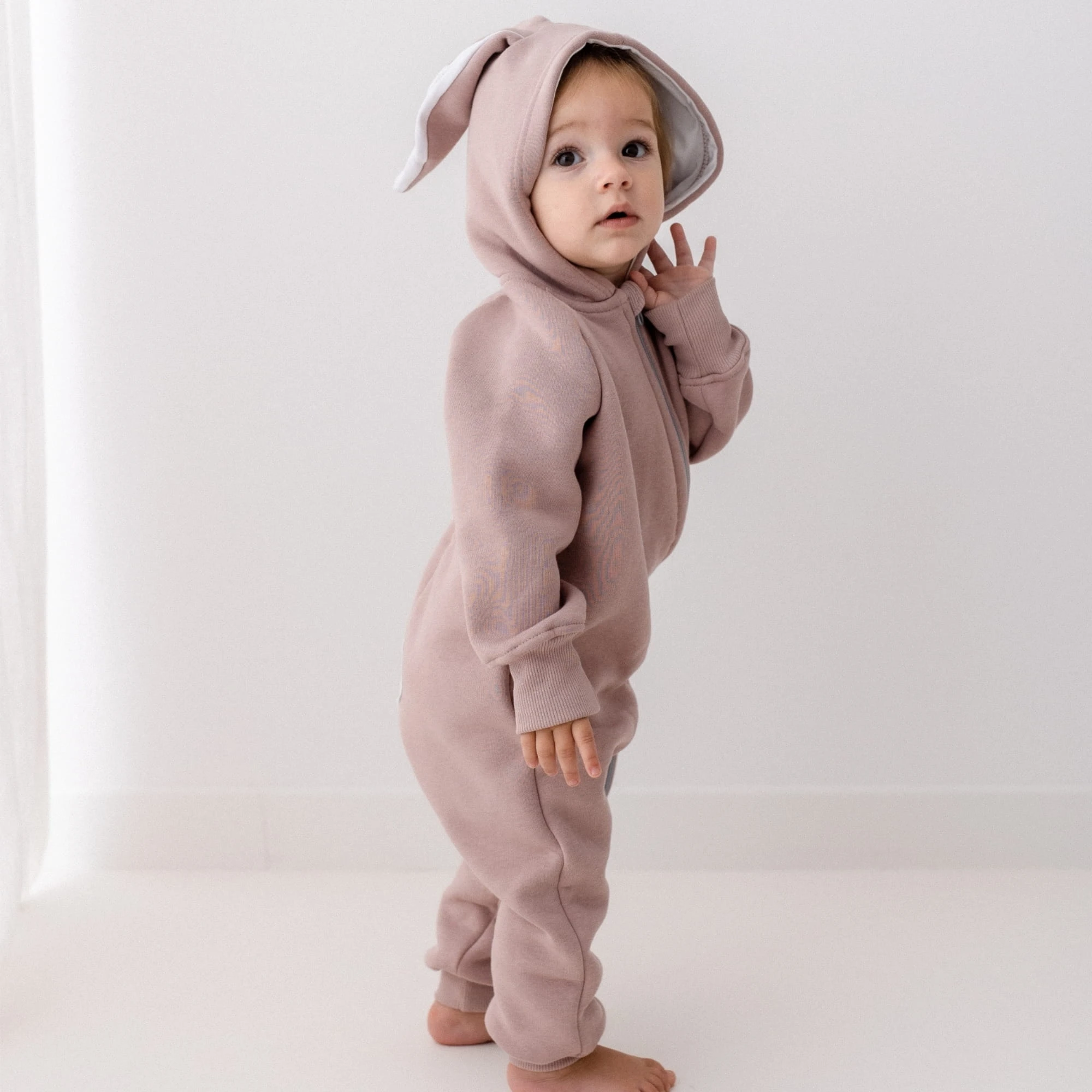 Rampers z uszami w kolorze róż vintage to ciepły, wygodny kombinezon dziecięcy uszyty z mięsistej dzianiny o gramaturze 320 g/m2 (80% bawełna, 20% poliester), łączy miękkość naturalnego włókna z wytrzymałością konstrukcyjną.
