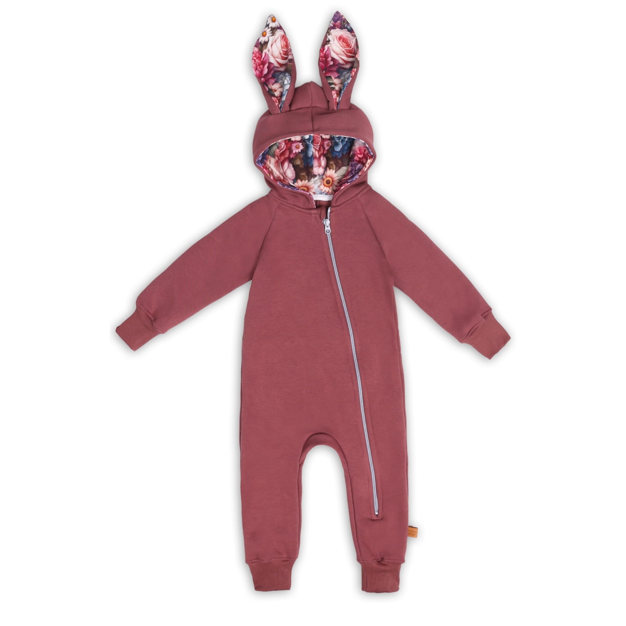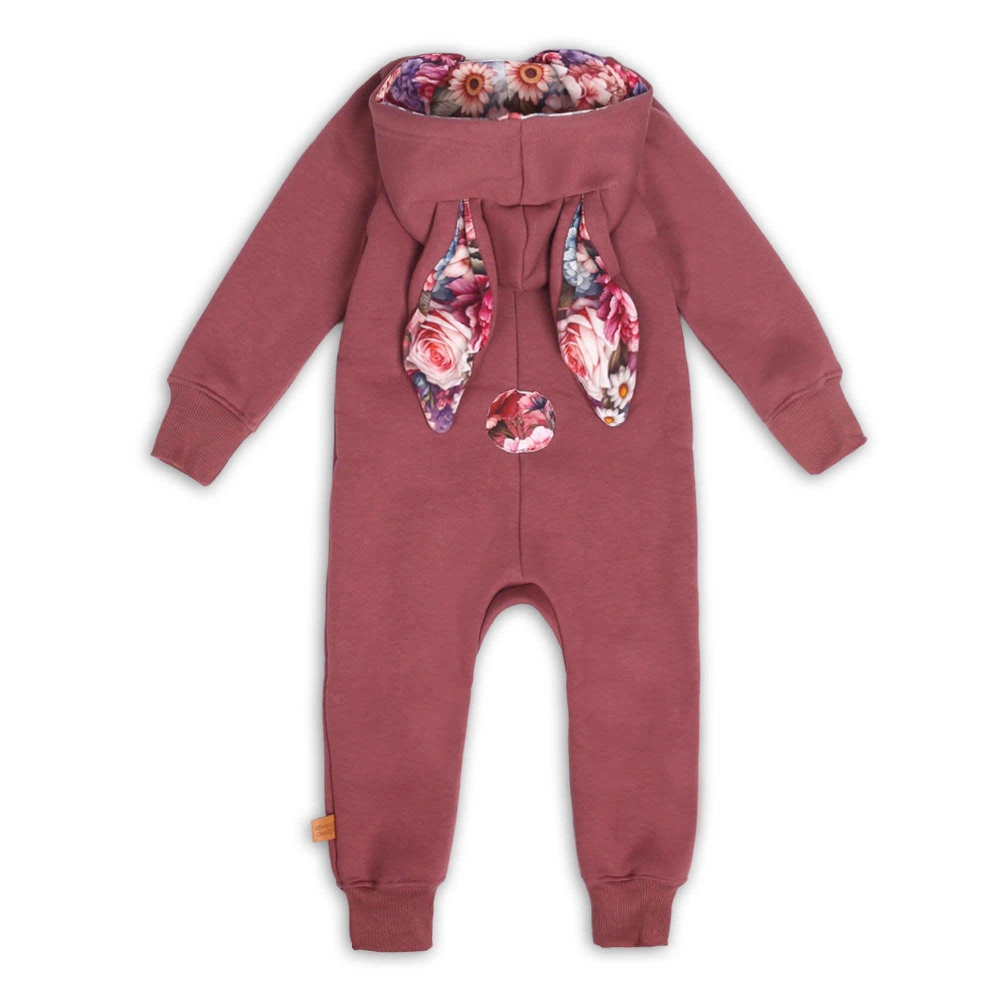 Rampers z uszami w kolorze zgaszona malina to ciepły, wygodny kombinezon dziecięcy uszyty z mięsistej dzianiny o gramaturze 320 g/m2 (80% bawełna, 20% poliester), łączy miękkość naturalnego włókna z wytrzymałością konstrukcyjną.