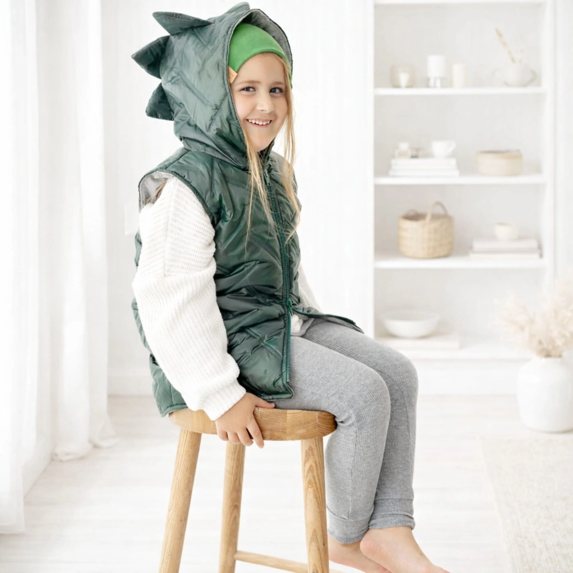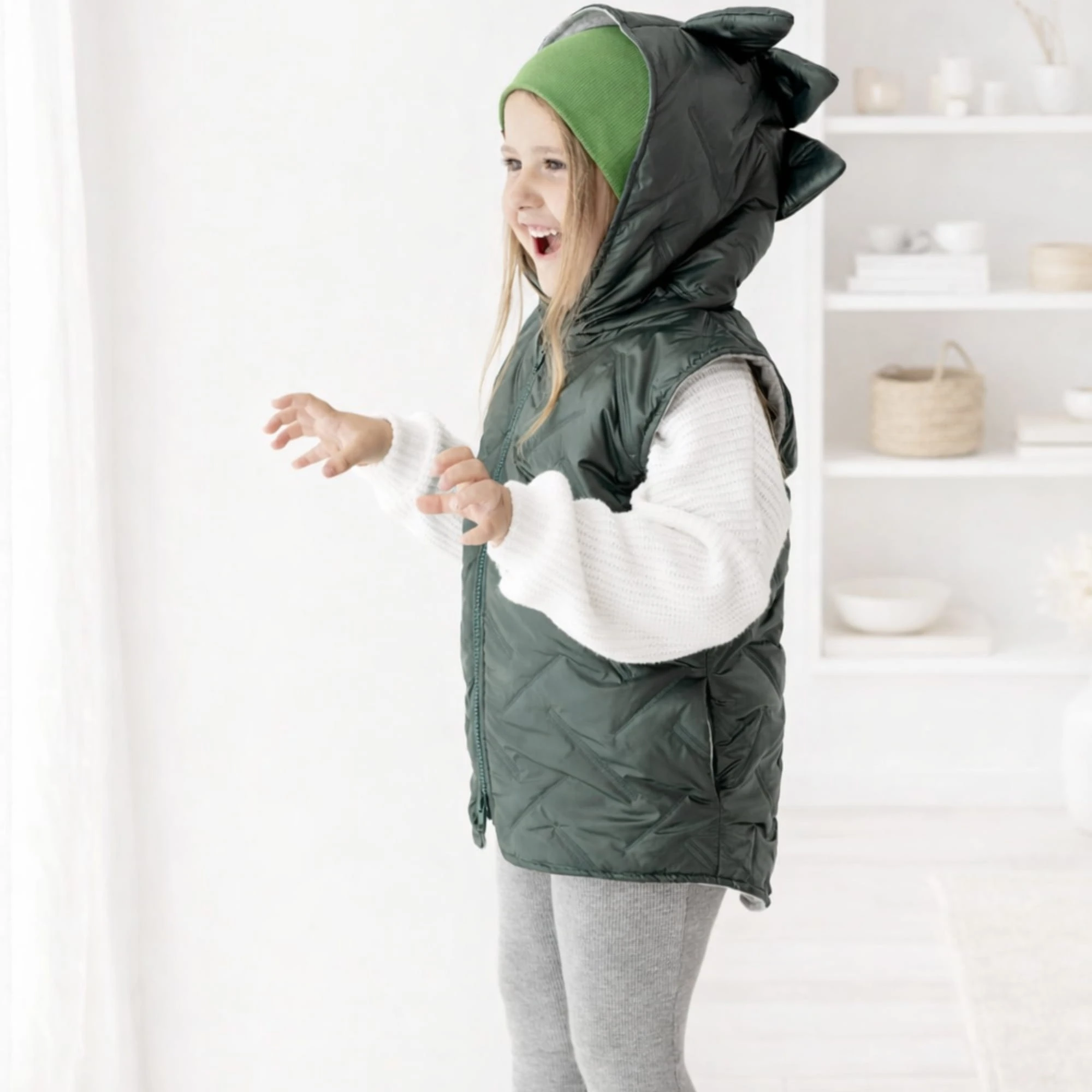 Pikowana kamizelka z uszami to lekka i wygodna warstwa na chłodniejsze dni. Kamizelka posiada praktyczne kieszenie po bokach, a miękka bawełniana podszewka zapewnia komfort noszenia. Charakterystyczne kolce dinozaura na kapturze nadają jej wyjątkowy styl Diverso.